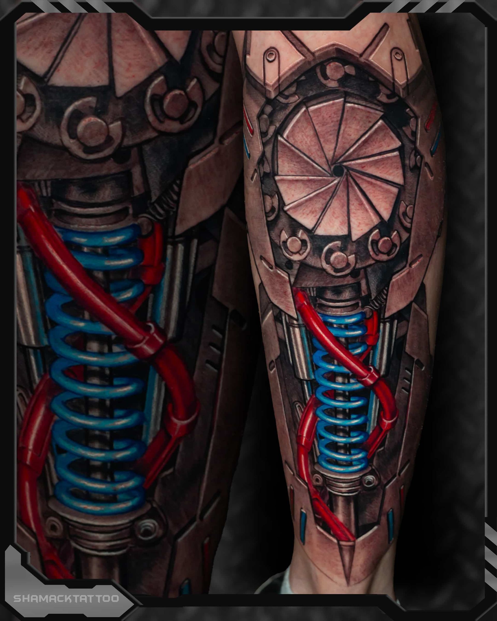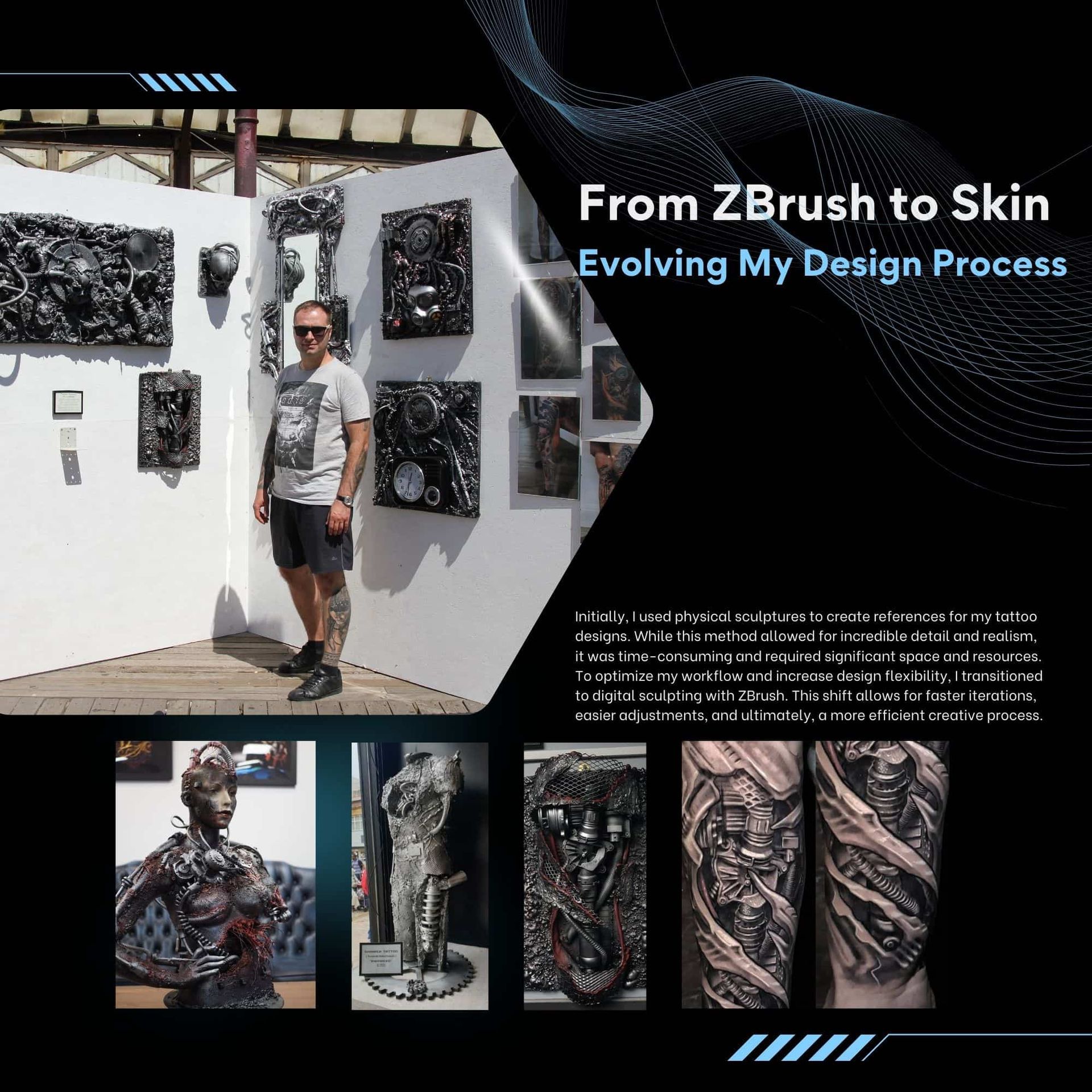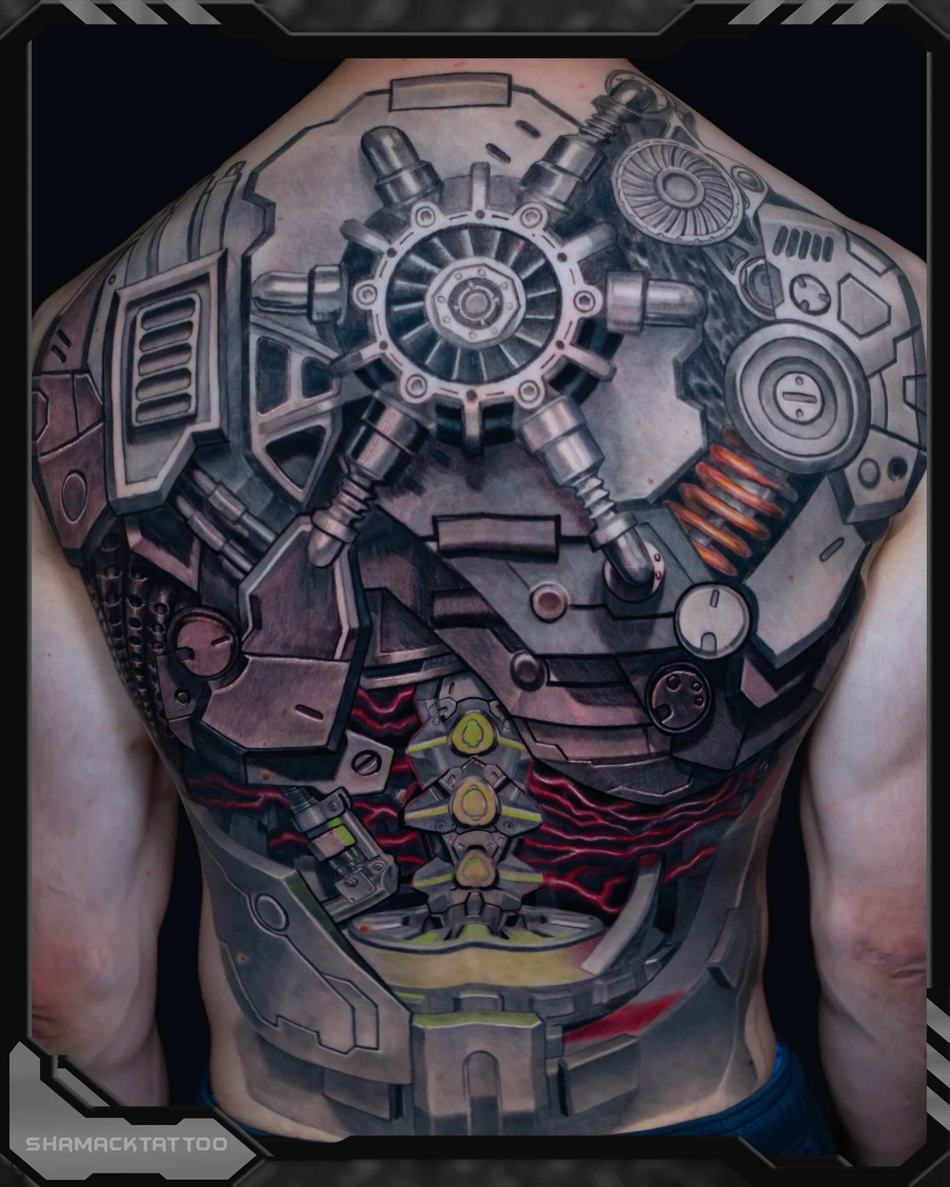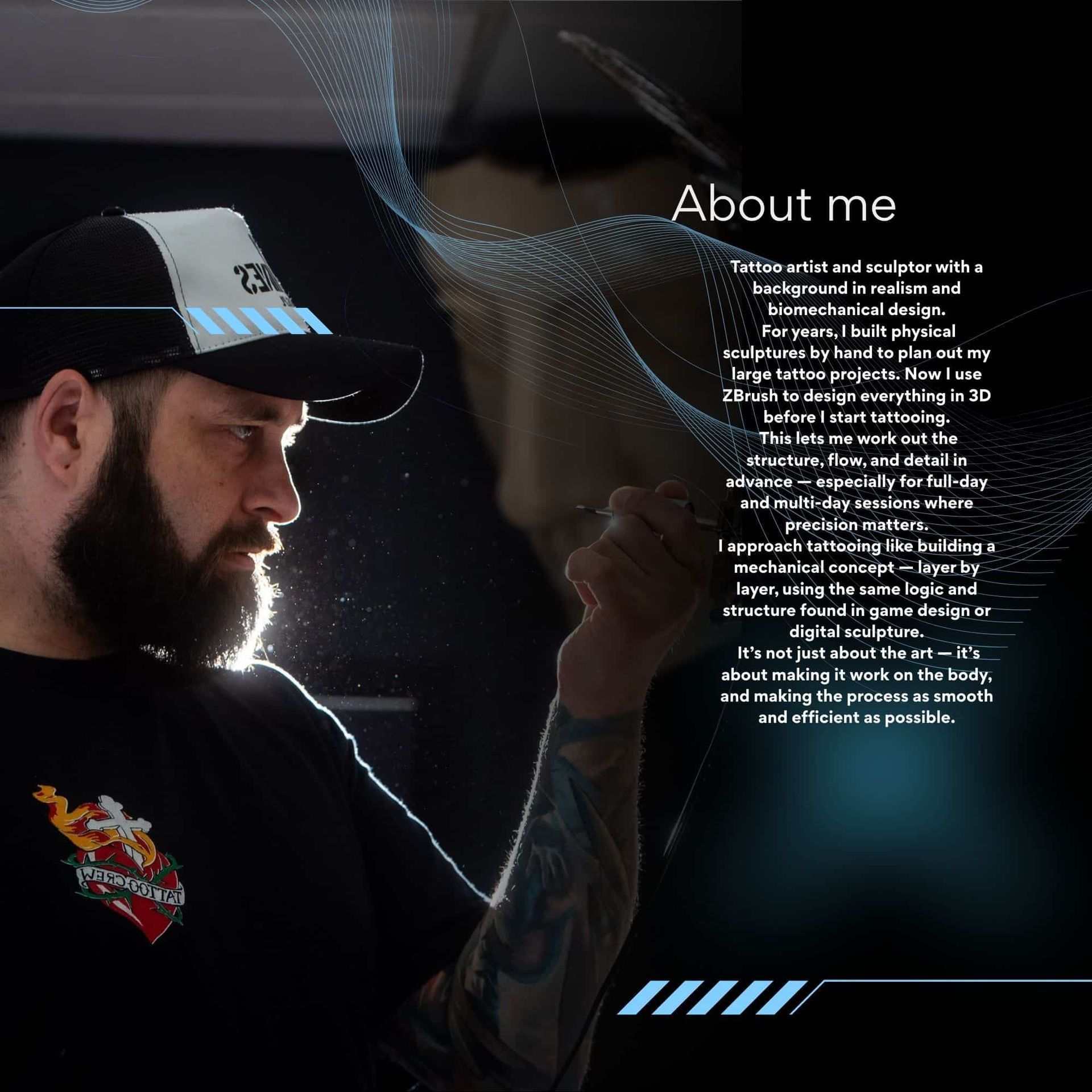 painting, sculpting, and 3D design. Using advanced software, I build fully custom tattoo concepts before the session even begins — giving each client a unique, tailored piece that bridges organic and mechanical worlds.