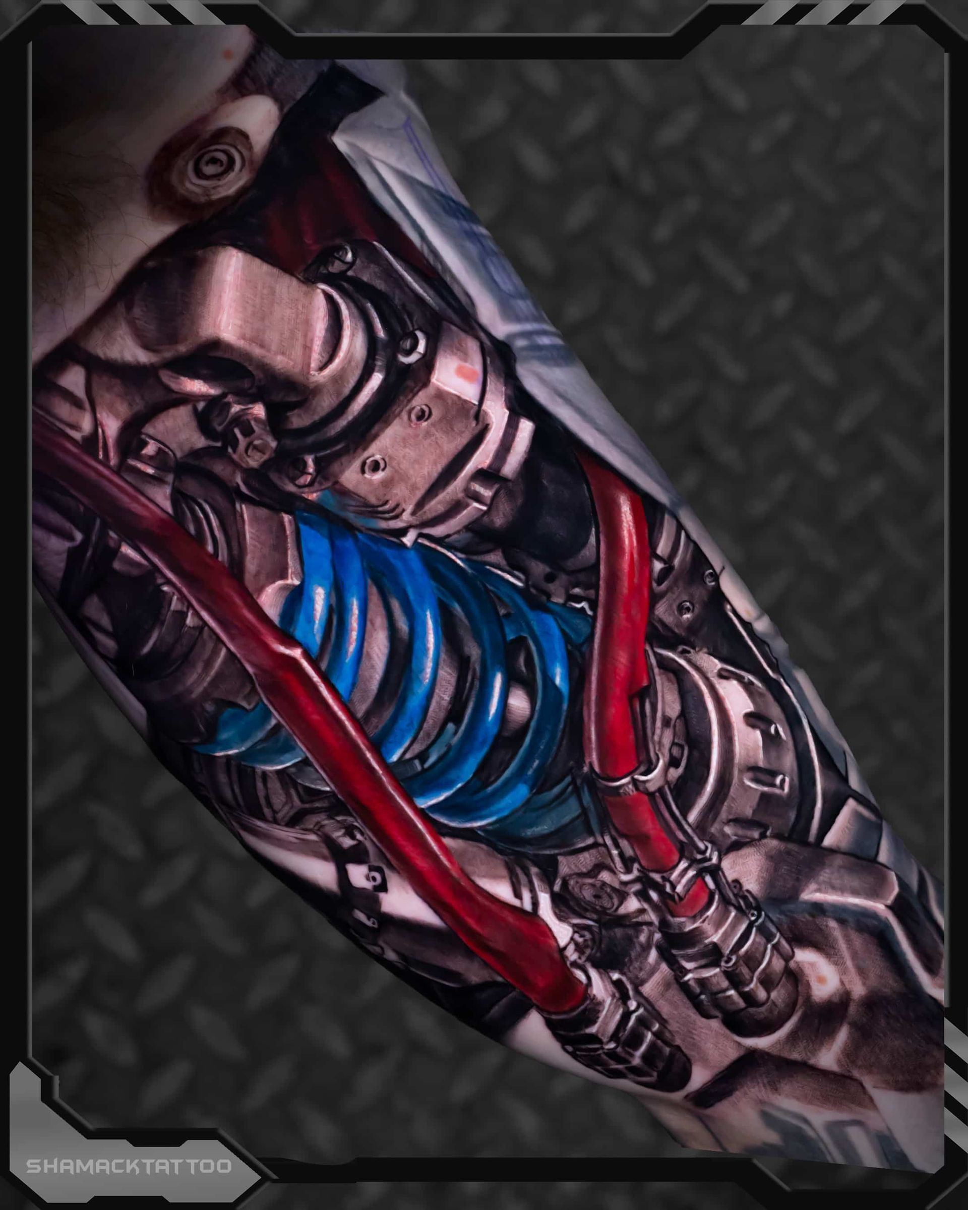 realism, biomechanical, and portrait tattoos, drawing from my background in